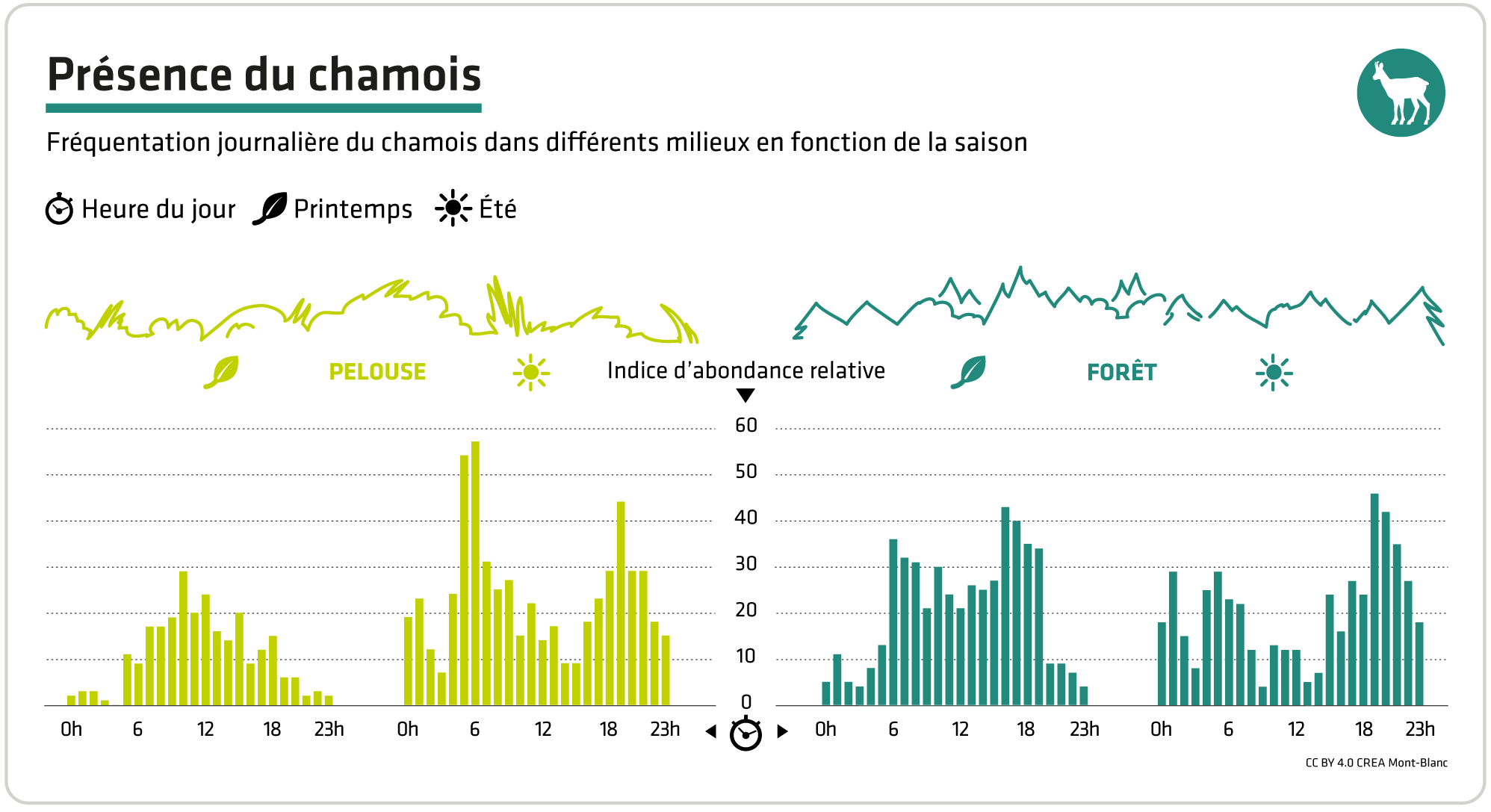 Large herbivores are relatively sedentary but they adapt their daily rhythms and how often they use different habitats according to the season. The example of the chamois shows an increased presence on grassland during the summer and in forests in winter, sometimes at low altitude. Similarly, its daytime activity in winter is very different to the summer and sometimes even includes nocturnal activity.