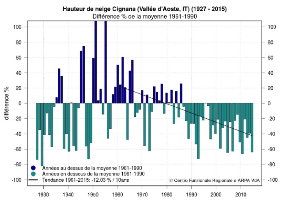 La neige recule en durée et en abondance, notamment à basse et moyenne altitude. Depuis les années 1970, la durée d’enneigement entre 1100 m et 2500 m s’est réduite de 5 semaines dans les Alpes du nord. Elle s’est proportionnellement plus réduite à 2500 m (- 25 %) qu’à 1500 m (- 12 %) puisqu’à basse altitude les jours de neige étaient déjà moindres. Côté hauteur du manteau neigeux, on observe une baisse de 50% de la hauteur maximale de neige dans la station de Cignana à 2150m en Vallée d’Aoste italienne par rapport à la période 1961-1990. Ceci représente une baisse de plus de 10% par décennie.