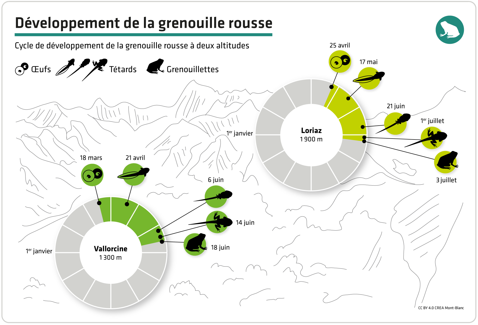Le cycle de développement de la grenouille rousse (Rana temporaria) est adapté aux conditions particulières de la montagne. Il est étroitement lié à la date de déneigement des mares donc plus tardif en altitude, mais aussi beaucoup plus rapide qu’à basse altitude, ce qui permet à la grenouille rousse d’être présente jusqu’à 2800m d’altitude !