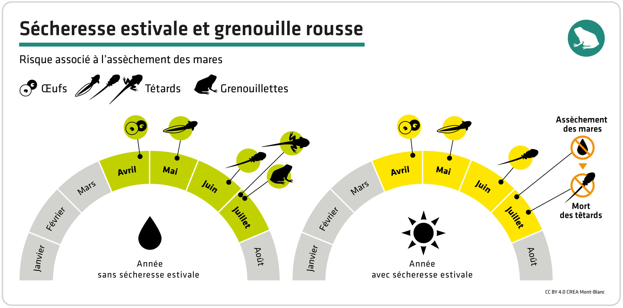 En revanche, les grenouilles pondent dans des mares souvent peu profondes (50 cm en moyenne pour les mares étudiées dans le Mont-Blanc). Or les jeunes sont strictement dépendants de l’eau jusqu’à un stade avancé de leur métamorphose. La survie des têtards est donc menacée si l’eau vient à manquer dans les mares, du fait d’un stock insuffisant de neige dans le bassin versant alimentant leur mare, ou du fait d’une sécheresse estivale.
