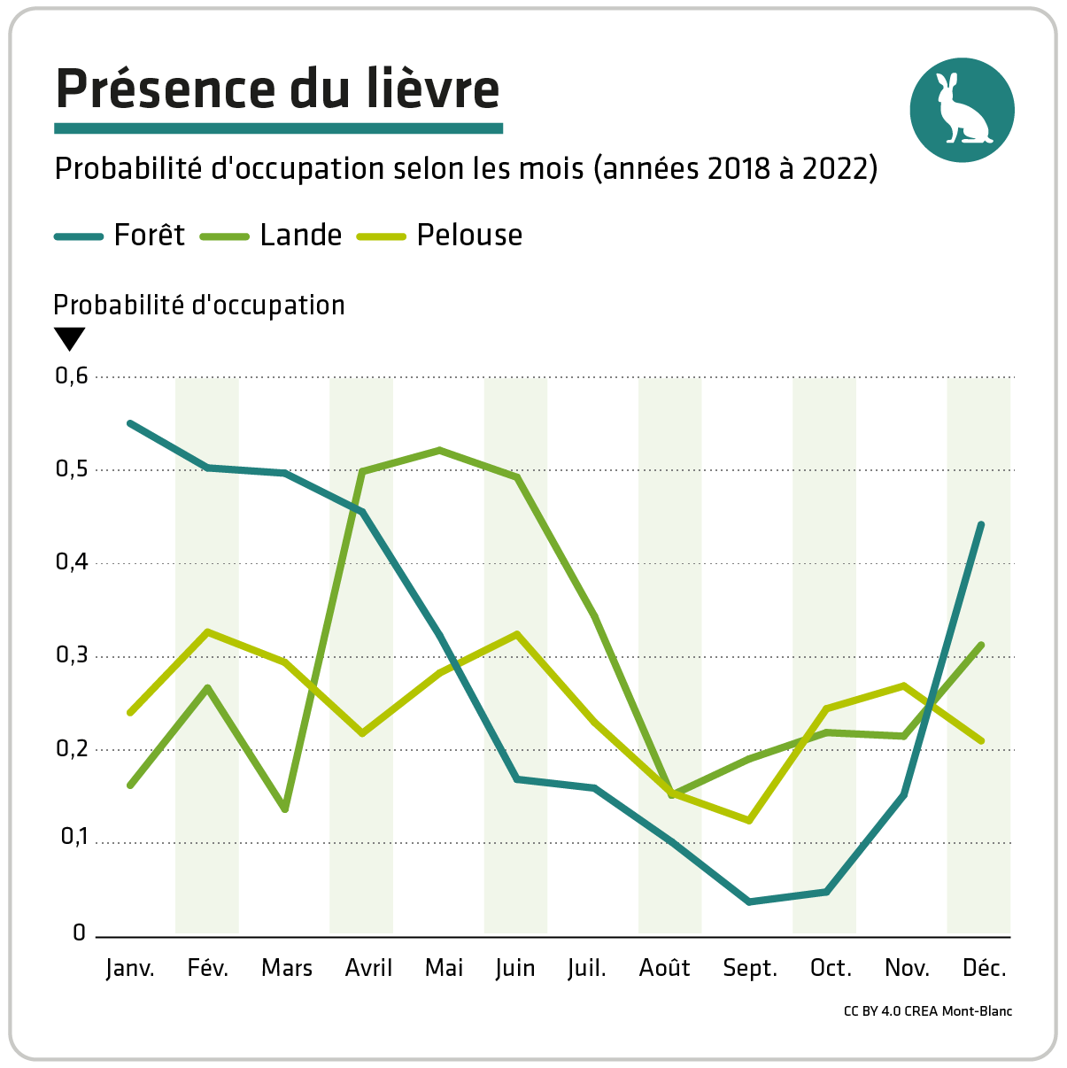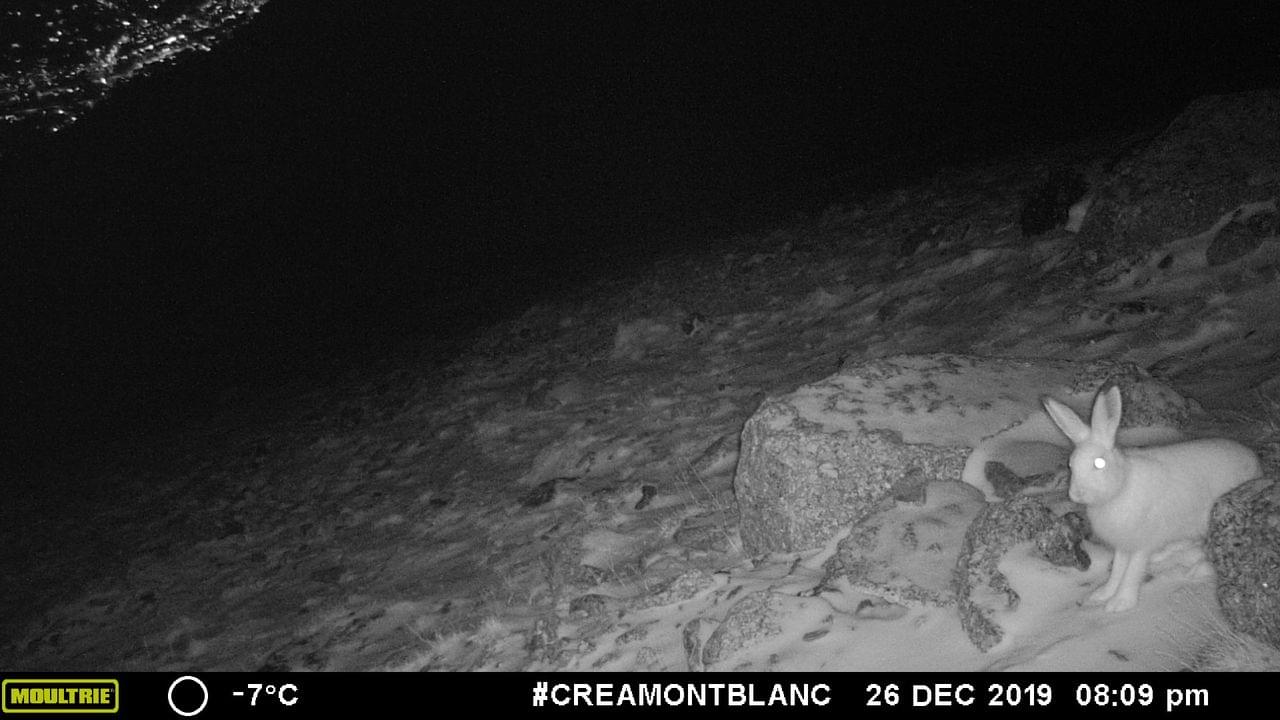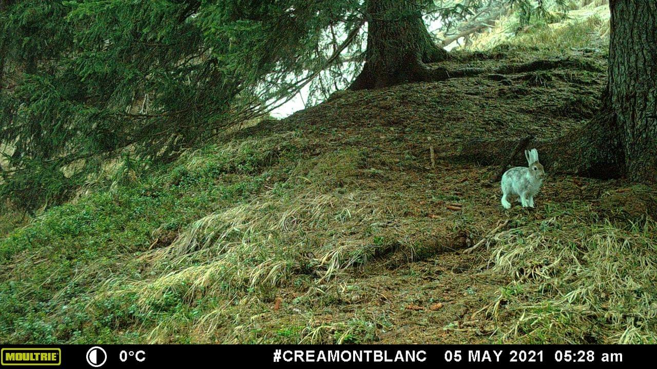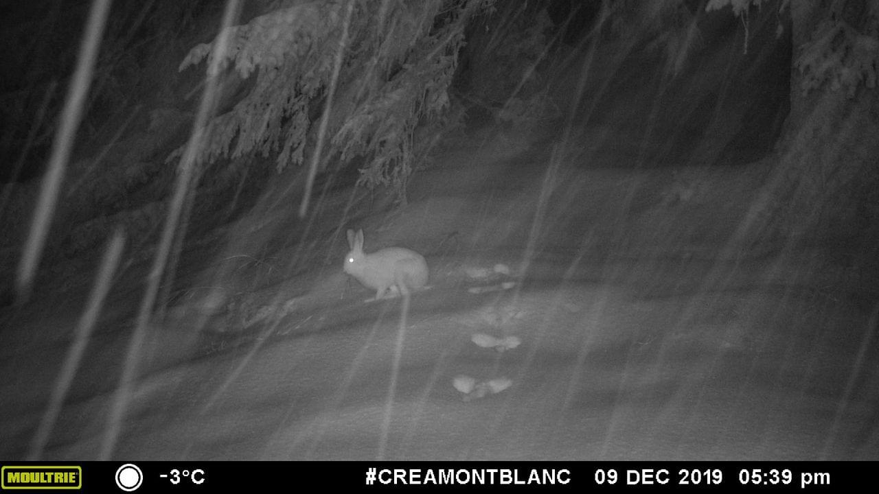 Les pièges photographiques du massif du Mont-Blanc démontrent que le lièvre variable est mobile sur un versant avec une stratégie d’occupation de la mosaïque de végétation au cours des saisons, avec un incontournable : la possibilité de se cacher des prédateurs dans la végétation et de s’abriter du froid.