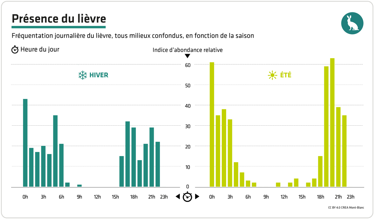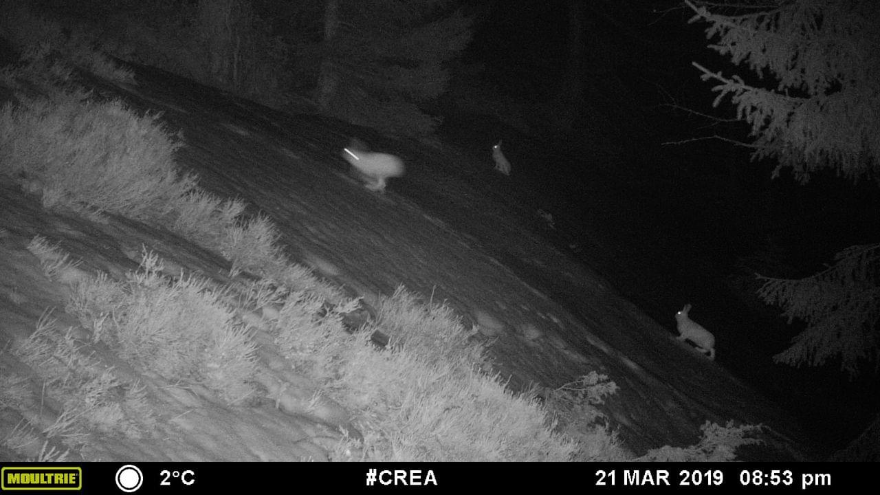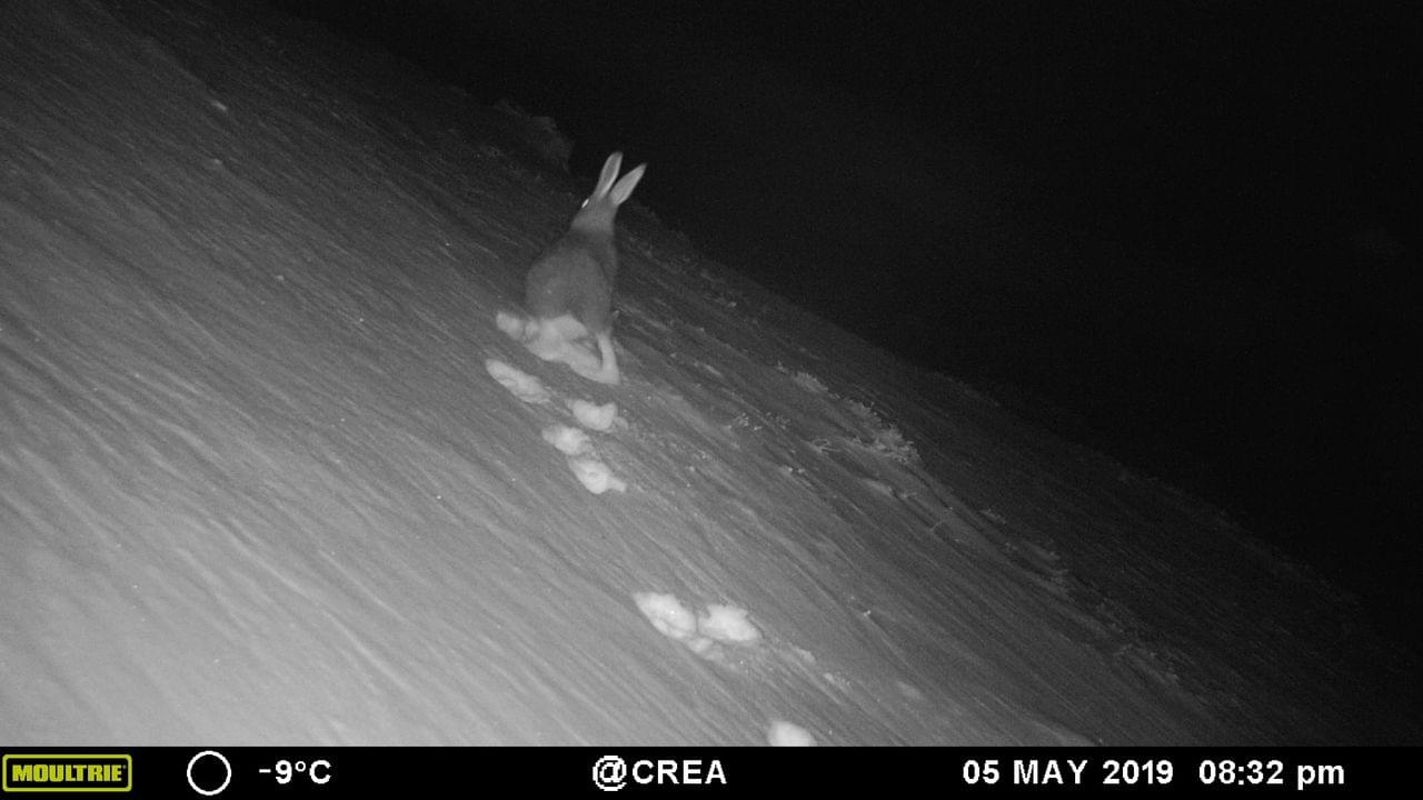 Les pièges photographiques du massif du Mont-Blanc démontrent que le lièvre variable est mobile sur un versant avec une stratégie d’occupation de la mosaïque de végétation au cours des saisons, avec un incontournable : la possibilité de se cacher des prédateurs dans la végétation et de s’abriter du froid.