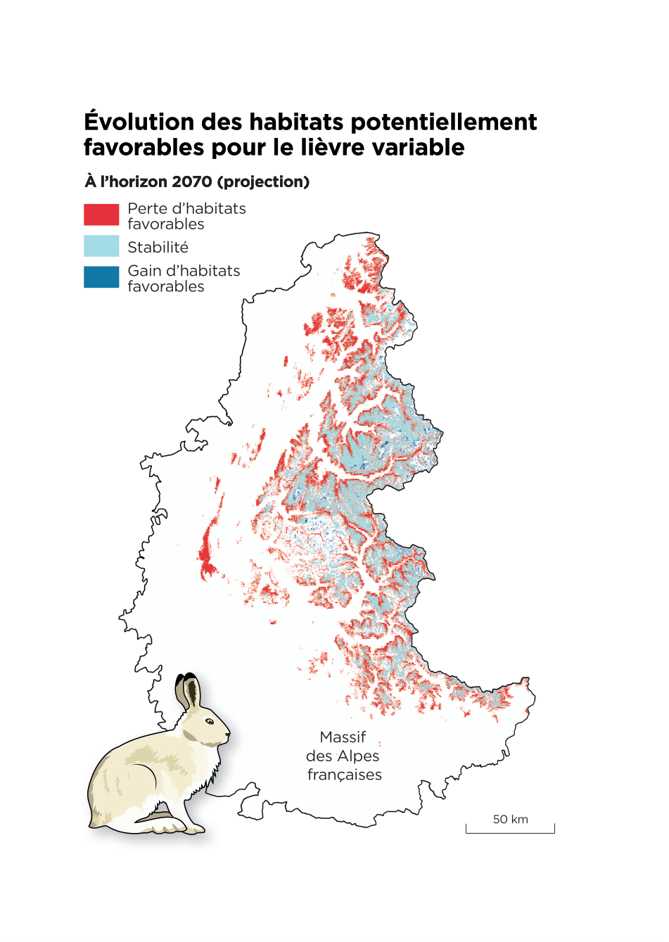 Ce portrait dressé par les données les plus récentes confirme la vulnérabilité du lièvre variable face au changement climatique : moins de neige et des températures plus élevées devraient permettre au lièvre d’Europe de remonter en altitude et en cascade de repousser le lièvre variable vers des zones de plus en plus restreintes aux hautes altitudes.