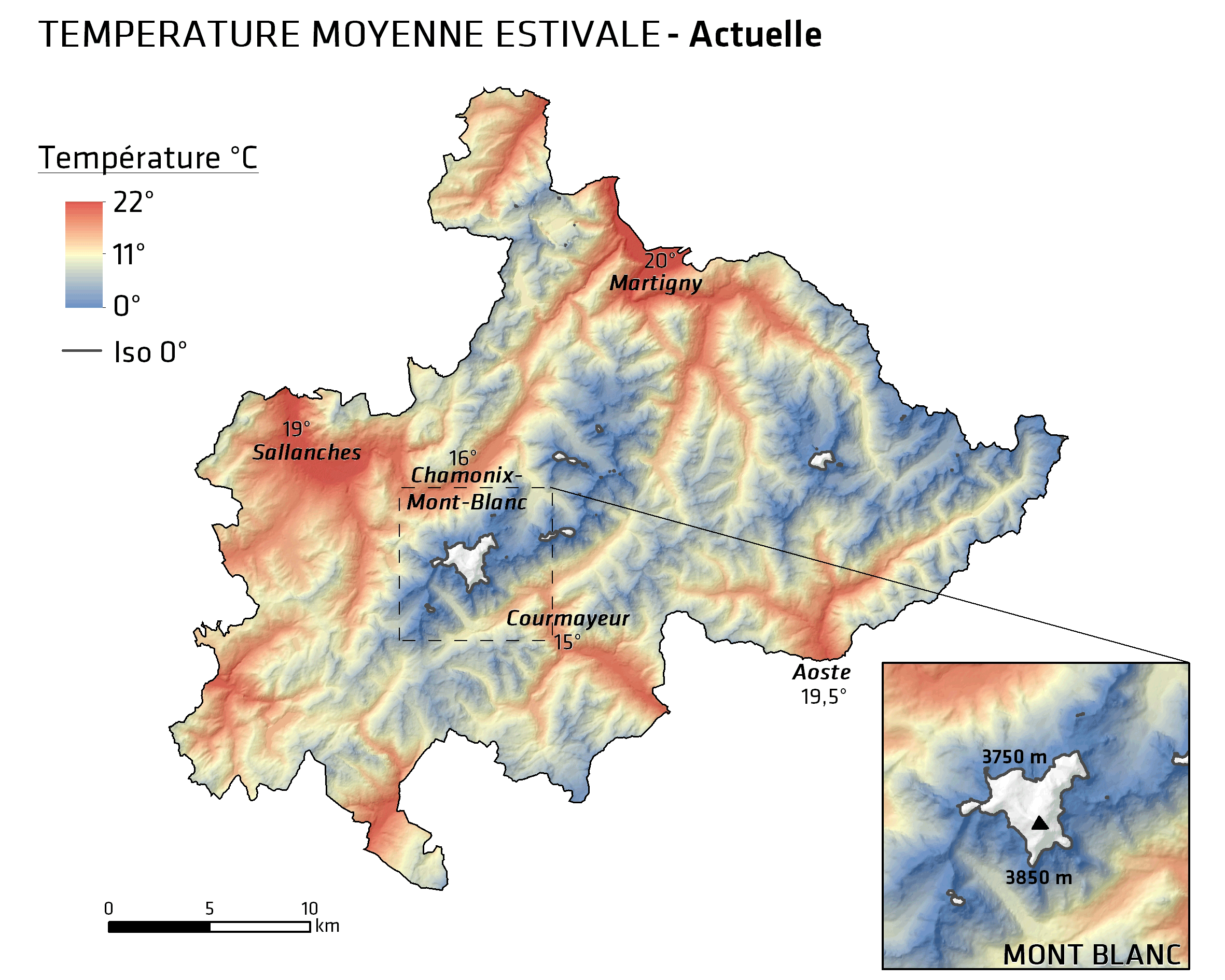 Les températures annuelles moyennes ont augmenté dans le massif du Mont-Blanc d’environ 2° C depuis 1864, deux fois plus qu’à l’échelle moyenne de la planète pour la même période (+ 0.9° C). Si nous poursuivons au même rythme nos émissions de gaz à effet de serre, le massif se réchauffera encore d’environ 3°C en 2050 par rapport à la période 1981-2010.