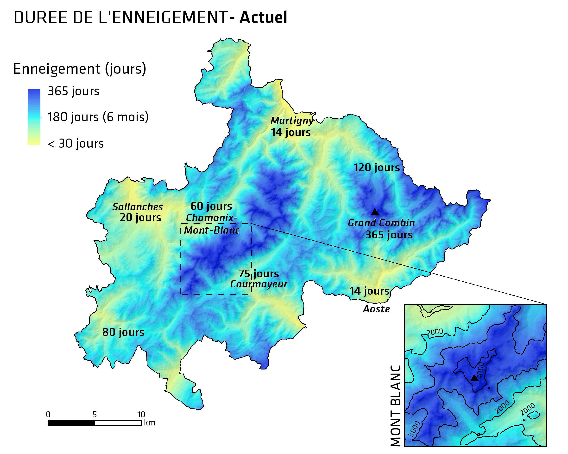 Dans la vallée de Chamonix à 1000m d’altitude et jusqu’à 2000m en versant sud, on observera probablement entre 4 à 5 semaines d’enneigement en moins par rapport à la période actuelle. Plus haut autour de 3000m d’altitude et en versant nord, on s’attend à perdre entre 10 et 15 jours d’enneigement d’ici 2050. Le recul de l’enneigement sera plus marqué au printemps qu’à l’automne.