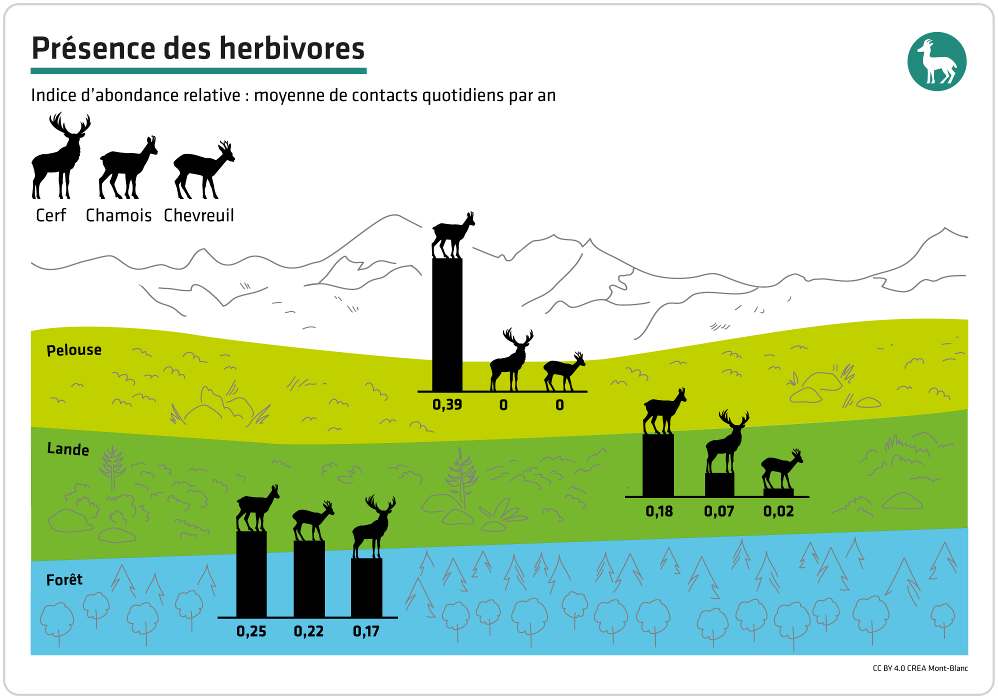 - Large herbivores (chamois, red deer, roe deer, ibex) use different natural environments in the massif (forest, moorland, grassland) in a species-specific way and according to the season.