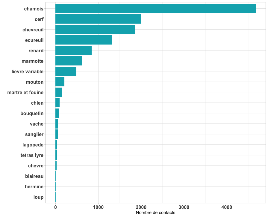 Large herbivores - chamois, red deer and roe deer - are detected most as they are the most abundant and/or the most easily picked up by the photo traps. This method is appropriate for studying their distribution over the slopes, the areas they occupy season-by-season and, given time, how their numbers develop.