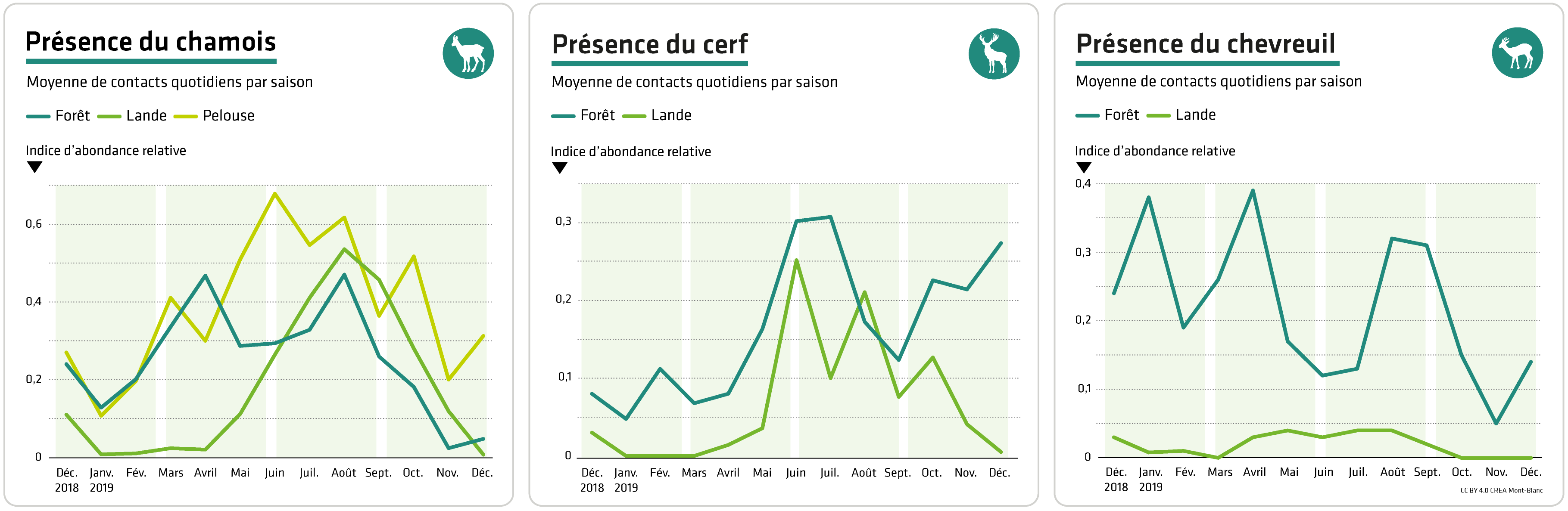 Cette mesure permet de définir un “indice d’abondance relative” de chaque espèce en fonction de la saison et des milieux. En effet, la fréquentation des milieux par les principales espèces de mammifères, notamment les grands herbivores, varie en fonction des saisons et selon l’altitude. Suivre la fréquentation par les herbivores des différents milieux du massif du Mont-Blanc (forêt, lande, pelouse) permet donc de comprendre plus finement les déplacements des animaux en fonction des conditions du milieu, lui-même soumis à des pressions comme le changement climatique.Cet indicateur croisé avec d’autres données, climatiques, de fréquentation humaine, écologiques… permettra d’affiner notre compréhension du fonctionnement et de l’évolution de ces espèces.