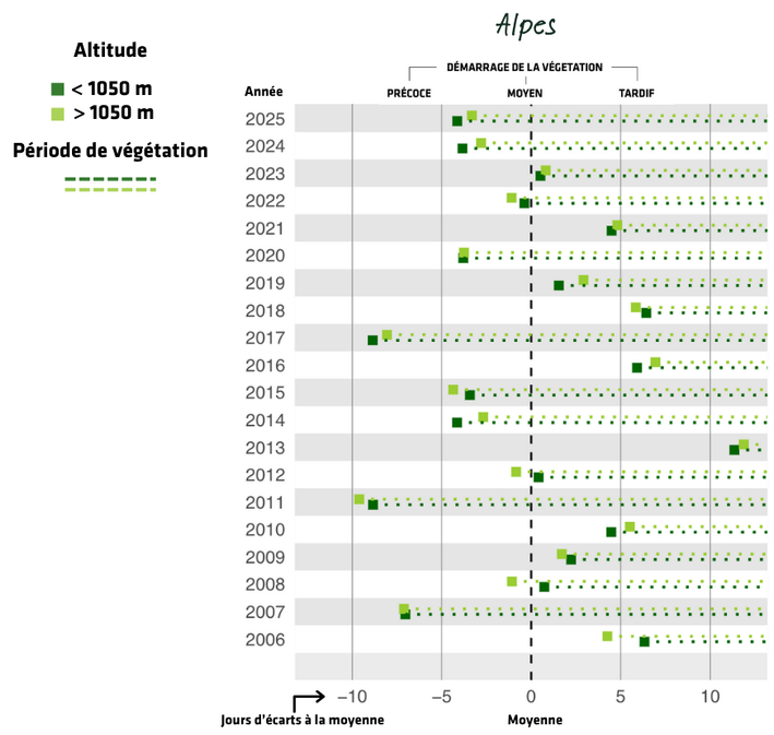 Cet indicateur donne des indications sur l’évolution phénologique à l’échelle des Alpes et cache donc de grandes disparités locales. Calculé sur des moyennes, il est sensible à la continuité des données d’observations dans les différents sites de suivi.
