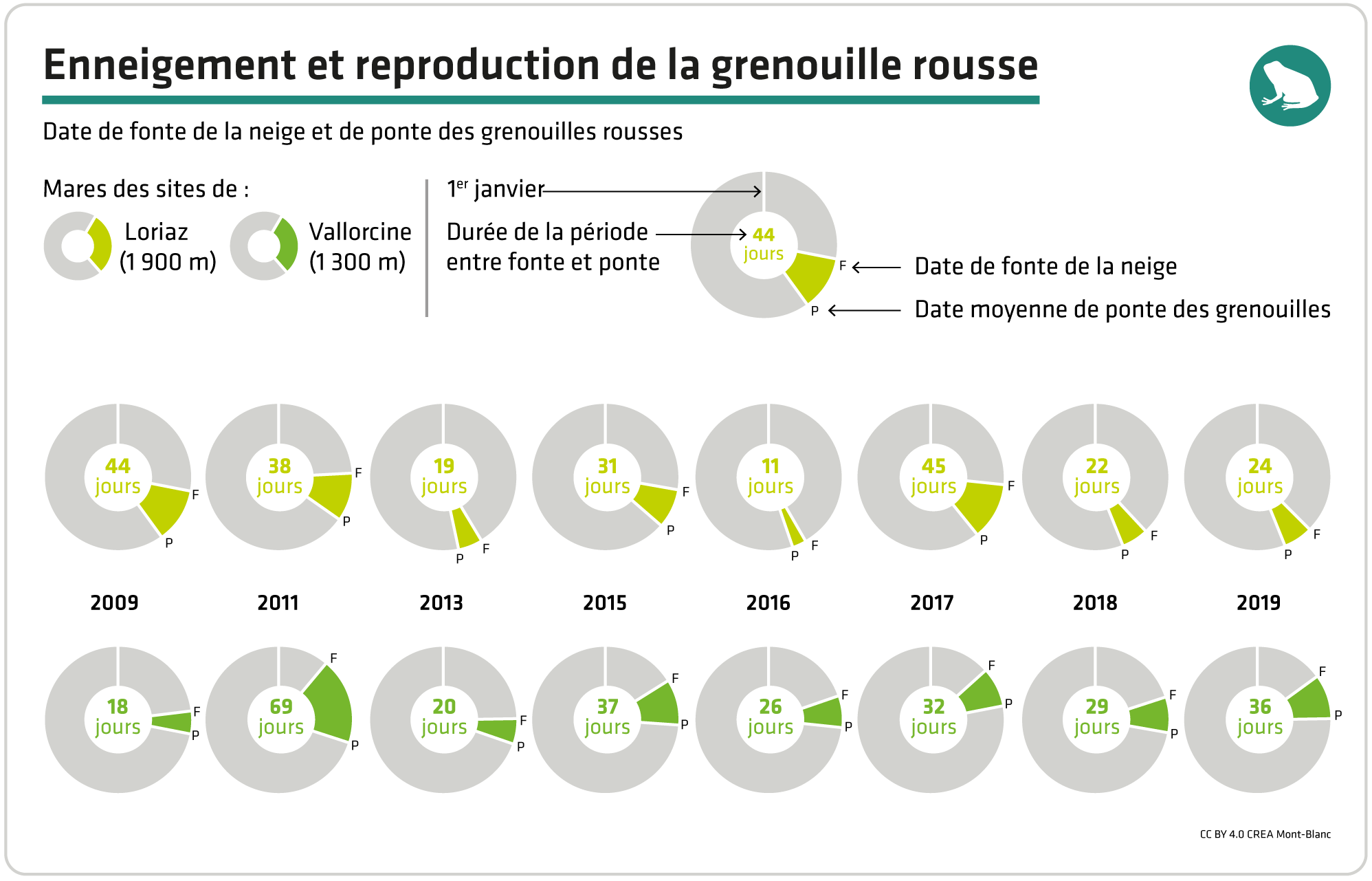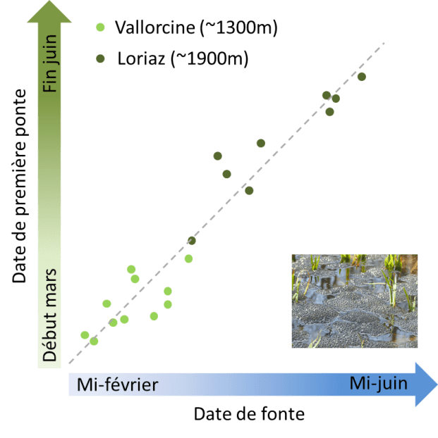 Dans le Mont-Blanc, les observations menées à Vallorcine (1300m) et Loriaz (1900m) depuis 2009 montrent des pontes de plus en plus précoces à basse altitude (1,4 jours d’avancée chaque année) mais plus tardives à haute altitude (1,7 jours de recul chaque année). Pourtant, sur cette période de 11 ans - peu significative à l’échelle des évolutions climatiques -, ce sont les années extrêmes qui sont intéressantes, plus qu’une tendance moyenne. Ainsi, la première ponte à 1900m a été observée le 5 mai en 2011 (année très peu enneigée) mais le 29 juin en 2016 (année tardive). Si une année comme 2011, aujourd’hui extrême, devient habituelle, cette étude démontre la grande « plasticité » des grenouilles, c’est-à-dire leur capacité à adapter leur phénologie aux conditions du moment, à pondre plus tôt lorsque la neige fond vite, et ce particulièrement en altitude.