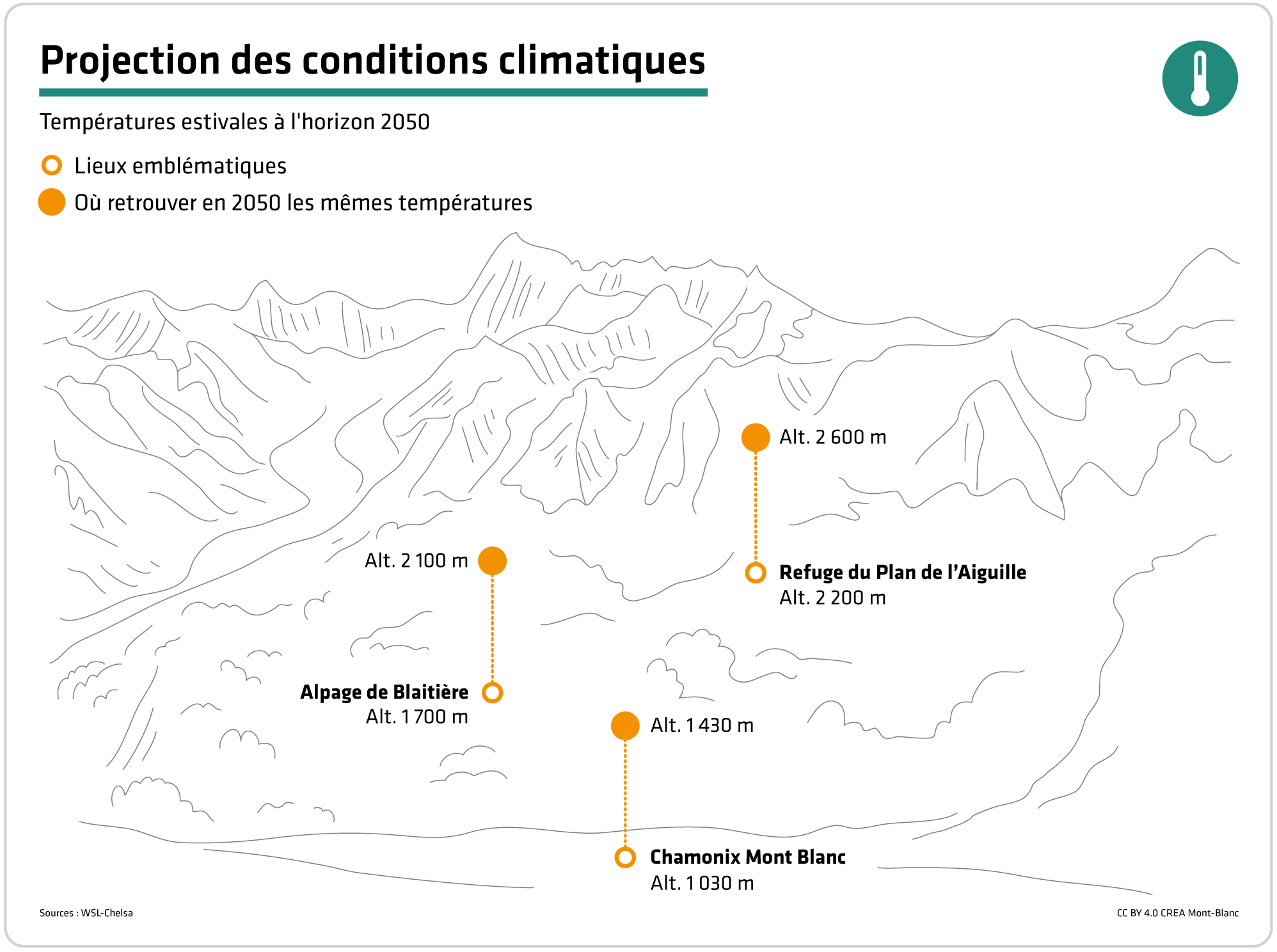 - Les températures augmentent rapidement dans le Mont-Blanc: +2°C depuis 1864 et +3°C d’ici 2050 par rapport à la période 1981-2010.